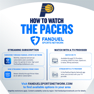 The network’s Season Pass subscription option is now available for fans to purchase the FanDuel Sports Network app for the entirety of the Pacers season for $108.99. From Oct. 7-29, fans can subscribe through Prime Video to get $10 off the Season Pass. Monthly and annual subscription options are also available for purchase at FanDuelSportsNetwork.com.